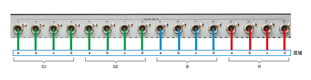 ●HD-SDI信号的情况下,Dual Green的4个系统可以和1至16号的SDI输入端子相连接。