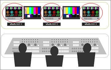 | Problem -difficult to adjust color to support color difference of each monitor -need large space for multiple monitors | Problem -difficult to compare each input waveform -need dedicated space for waveform monitor -difficult to compare picture and waveform | |