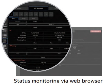 | Supported Format | SMPTE ST 2110(-10,-20,-30,-31,-40) ST2110-20: Video ST2110-30: PCM Audio Packet Time 1msec/125μsec、Conformance Levels A/B ST2110-31: AES3 Audio Packet Time 1/0.12msec、Conformance Levels A/B ST2110-40: Metadata SMPTE ST 2059-1/-2 SMPTE ST 2022-7 |