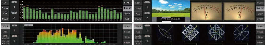 ・2 画面マルチ表示、音声レベルバー、リサージュ、VU メーター、LU メーター、スペクトラムアナライザー、